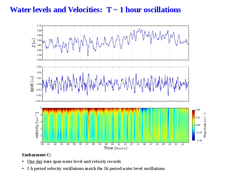 ●For the one day time period the plot shows clearly the correlation between velocity and water level oscillations with the same one hour period
