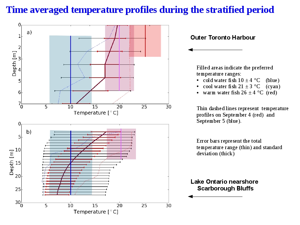 If we compare average temperature profiles in lake Ontario and Toronto Harbour with the optimal ranges for:1) Warm water fish, 2) Cool water fish , 3) Cold water fish