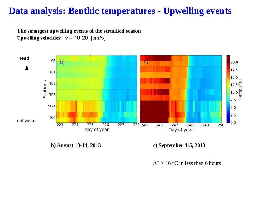 ●The zoomed in sections clearly capture the advancement of two upwelling events in between 3 to 4 August and 4-5 September when the water temperature dropped by more than 15 C in less than 6 hours